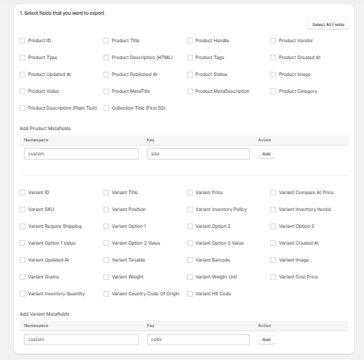 - With the Exporter app, you will be able to export the product metafield data for the products in your current store, however, you will not be able to add them to the products while uploading the same file in your other store. Shopify does not allow or support the feature.
