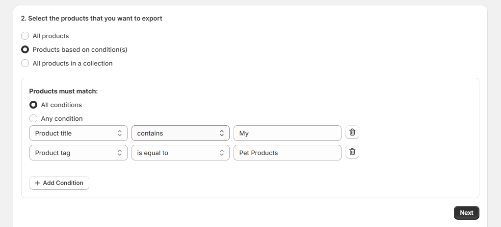 3. Next step is to select the products that you want to edit. You can select more than one condition. Click 'Next'.