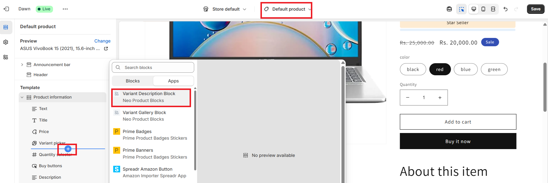 Go to "customize theme settings" > Select the Product template > Add and place the "Neo variant description block" as per your requirement.