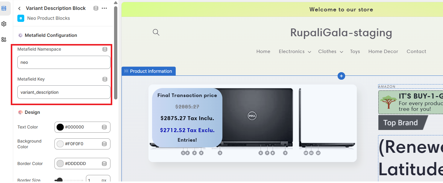 In the block settings, enter the Namespace and Key of your existing variant-level metafield.