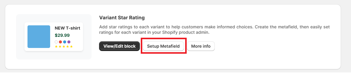 2. Click on "Setup Metafield" to automatically create a variant-level metafield called neo.variant_star_rating