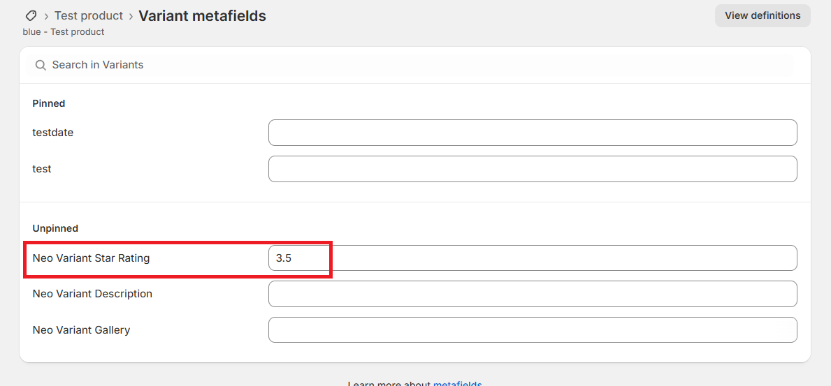 2. Scroll down to Metafields and look for "Neo Variant Star Rating ".