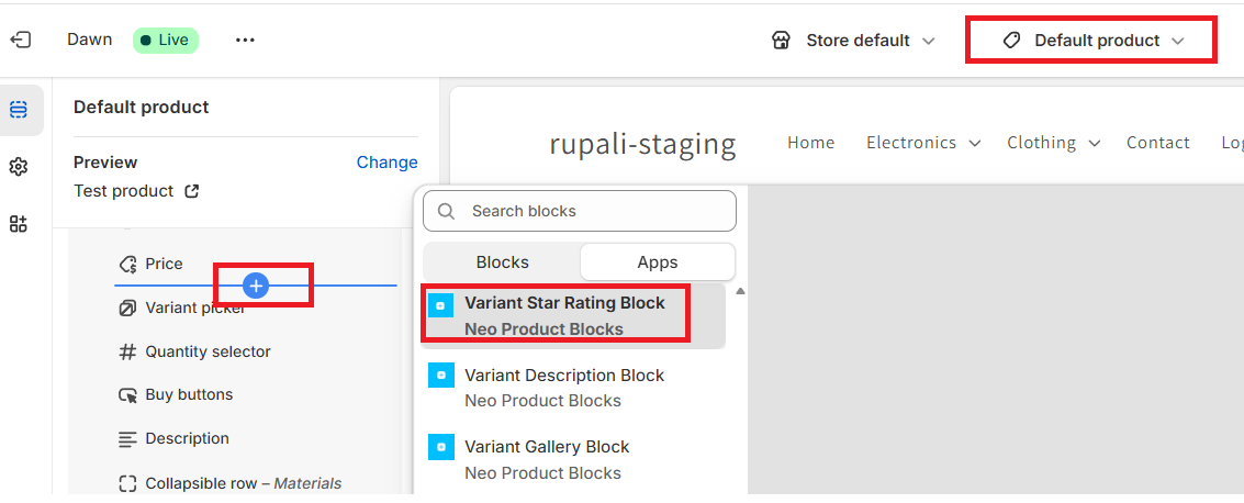 Go to "Customize theme settings" > Select the Product template > Add and place the "Neo Variant Star Rating block" as per your requirement.